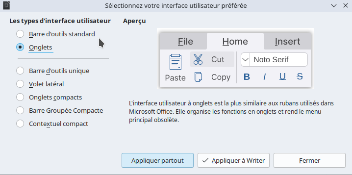 L’interface de LibreOffice peut être personnalisée en fonction de vos habitudes de travail ou votre goût en passant par le menu Affichage et Interface utilisateur (cf l’article des rubans sous Libre Office).