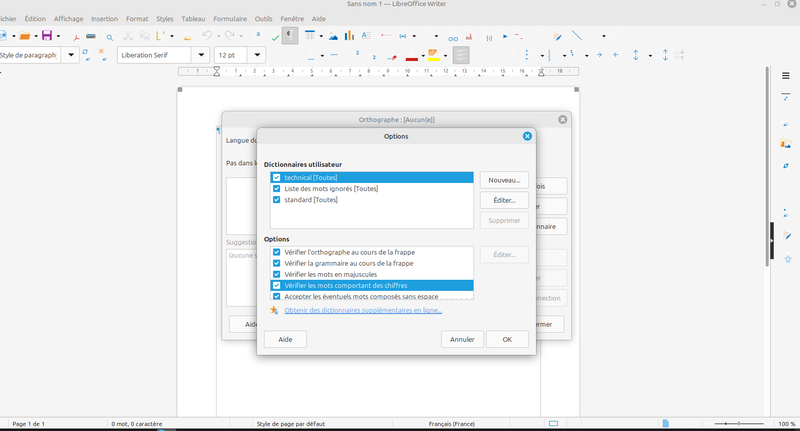 On peut utiliser un correcteur d’orthographe, mais le logiciel ne dispose pas de correcteur grammatical (vous devrez installer Grammalecte). Il est aussi possible de personnaliser la correction des textes avec différentes options. Vous avez également la possibilité de créer votre propre dictionnaire.