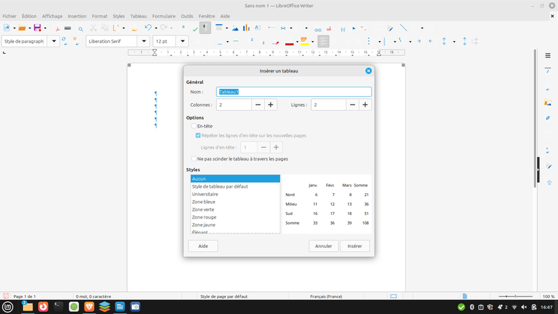 Les tableaux se font par l’intermédiaire du menu tableau.