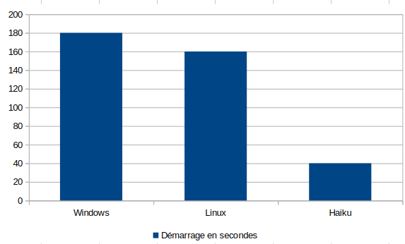 L’impression de rapidité qui se dégage est confirmée : Haiku démarre 4,5 fois plus rapidement que Windows, et 4 fois plus vite que Linux