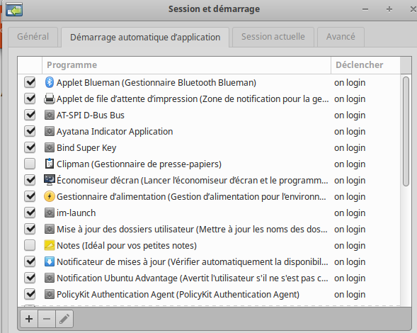 Paramètre / Session et démarrage / Onglet démarrage automatique d'application
